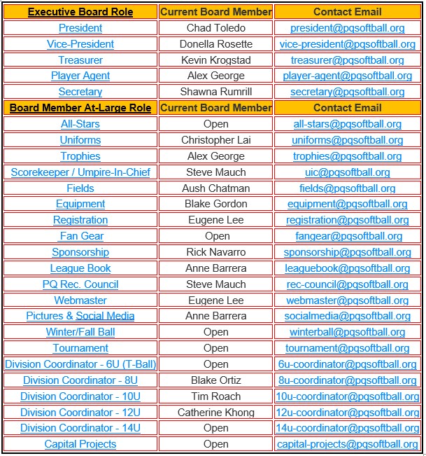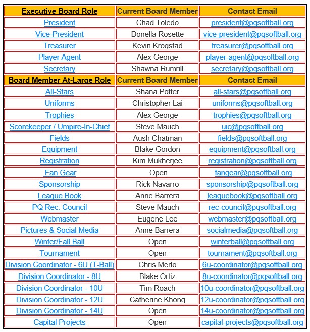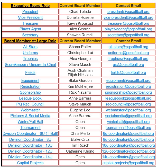 PQ Girls Softball Association Board Roles